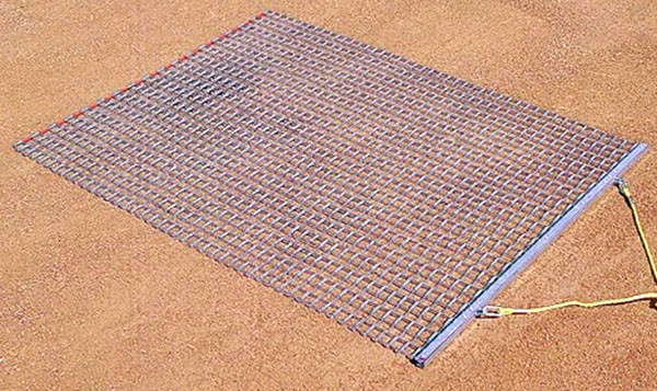Drag Mat made of corrosion resistant galvanized steel. Heavy duty metal angles across front of mat for pulling with help of 16 mm polypropylene rope to smooth out uneven surface. Mesh size is 1.5" x 1.5".