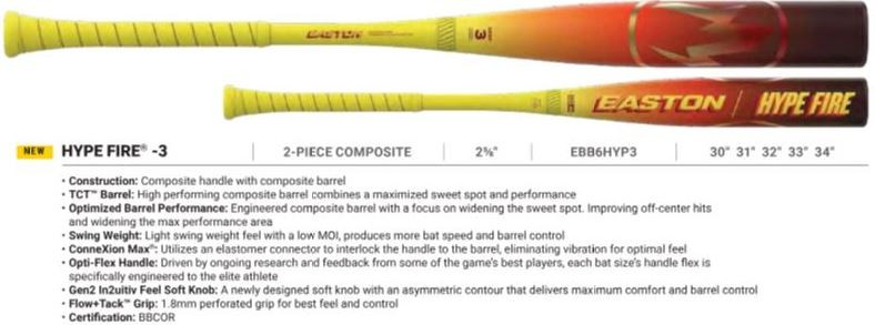 Click the button below to add the 2026 EASTON HYPE FIRE -3 BBCOR BASEBALL BAT to your wish list.