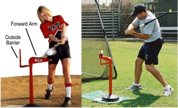 The forward arm eliminates "dipping" or dropping the hands and shoulder to lift the ball with a "looping" type swing. If you "dip with the Advanced Skills Tee, you hit the back of the arm. It forces you to take the hands straight to the ball, leveling the swing at the point of contact. It also puts the ball off the plate and gives a visual aid in which direction to drive the ball, depending on the pitch location.