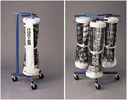 Storage racks spin easily on support systems to neatly grasp and store the headband of the nets as unit glides across the floor on frictionless swivel type casters. Heavy-duty all steel construction has a durable powder-coated finish.
