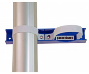 This storage rack provides a convenient and safe method for storing two volleyball standards in a compact space. Each upright is held in place with a hook-and-loop closure. Wall installation hardware included.