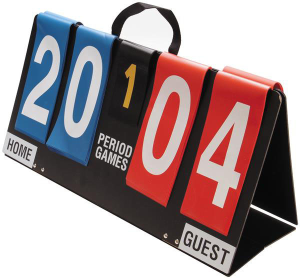 A solid long lasting flip scorer with big 9.5" vinyl numbers on a 24" x 12" heavy plastic board. Scores 0-99 with a 5 period indicator. Folds flat for storage and comes with built-in handle strap.
