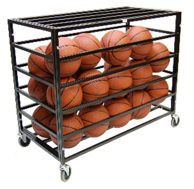 Full size secure ball locker. Constructed of heavy duty black powder coated steel tubing. Lockable hinged lid for security. Swivel caster wheels for easy mobility. Size: 46"L x 24"W x 37"H.