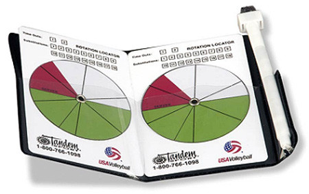 Official USAV licensed product! New and improved design allows for rotation tracking of two teams simultaneously. Pocketsize for easy handling, the double rotation locator actually rotates to allow for accurate player tracking. Substitutions and timeouts can also be tracked. Includes a dry erase marker and a handy carrying case. Measures approx. 4.5”L and 3”W. Width increases to 6.5” when carrying case is fully extended.