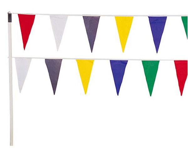 Pennants made of nylon cloth 12" long, available in assorted colors. Total length 100 Foot.