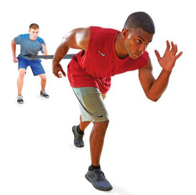 This resistance training device is the most economical training device. Requires two players/athletes for training; one provides resistance while other one runs. Includes 10' long strap attached to 2 waist belts adjustable up to 42" waist.